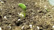 | ButterbeansButterbeans, also known as Lima beans are a green vegetable which are nutritious and sweet. It first grew in South America. Butterbeans take at least 12 weeks to grow fully before you can use them to eat. Because it is a soybean, eating them can help your heart! DirectionsWith your Butterbean seeds and all of your tools ready, it is time to plant and grow some Butterbeans!  A Butterbean seed. Step 1First, you have to separate and count the seeds that you want to plant. Butterbean seeds are large, so they are very easy to separate by hand.  Leave a little space from the top of the pot. Step 2Then, either use your hands or a small cup to put your soil into the pot. This can be messy! You might want to do this outside, or over your sink because the soil can clump together and spill. Fill the pot with soil until it is close to the top. Gently push on the soil so it is a little firm, but do not too push too hard.