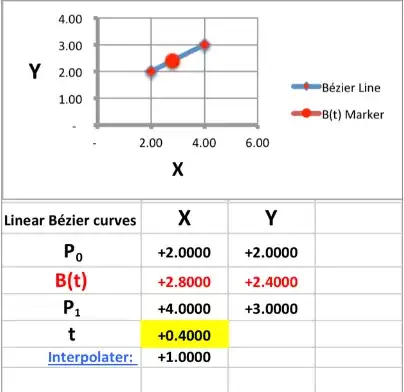 - The curve is given by B(t) = P0 + t*(P1 - P0) = (1-t)*P0 + t*P1, where t is an element in the range [0,1], inclusive, and is equivalent to linear interpolation.