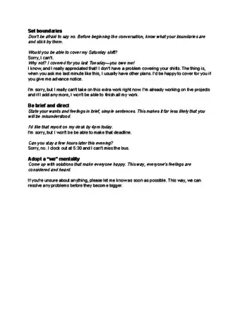 2Say “no” when appropriate. Saying no can be difficult for many people. However, saying “yes” when you need to say “no” can lead to unnecessary stress, resentment, and anger toward others. When saying no, it can be helpful to keep in mind a useful set of guidelines: