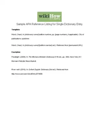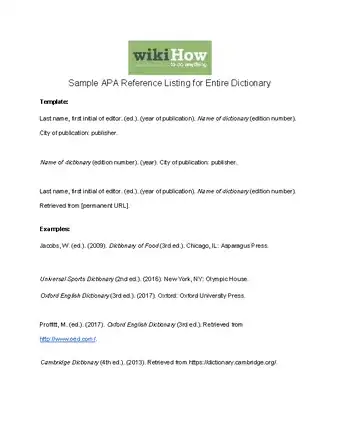 7Start with the name of the dictionary if you do not have an editor. In many cases, you may not be able to locate the editor of the dictionary. In this case, start with the name of the dictionary. Write the year in parentheses between the edition number and the place of publication. Your citation might look like:[21]