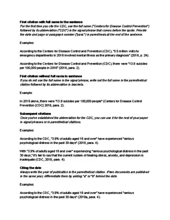 1Include the full name of the CDC and its abbreviation in the sentence introducing the quotation. For the first citation, if you use the full name of the Centers for Disease and Control Prevention in the signal phrase preceding the quotation, you can follow it immediately with the abbreviation in parentheses. Then, for each subsequent citation, you can simply use the abbreviation. In this case, you’ll only include the date and the page number in the in-text citation. In the absence of a page number (in the case of web articles, for instance), you can list the paragraph number (“para.”) followed by the paragraph number. For example:[4]