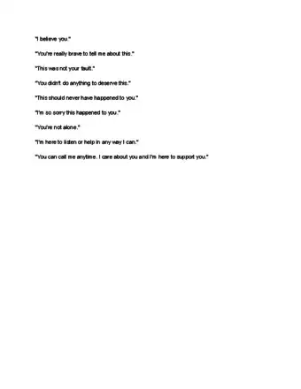 1Tell your friend you believe them. The most important thing you can do is let your friend know that you believe what they are telling you. Too often, victims are greeted with statements like, “Are you sure?” Instead, tell them, “I believe you. I hear what you are saying.”[1]