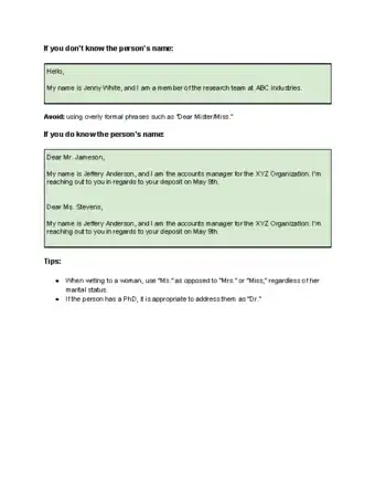 3Address the recipient. Include a salutation and professional greeting. This can be tricky if you're emailing a stranger, as you may not know their preferred name. There are a few etiquette guidelines, however, that can help you avoid missteps.