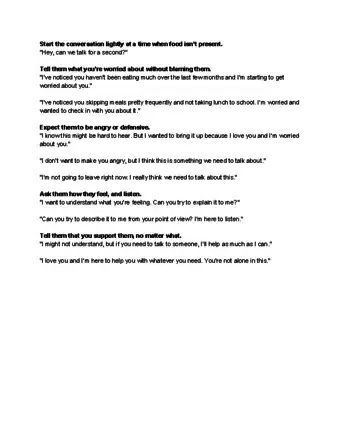 - Try asking about their emotions, such as by saying, “How have you been feeling lately?” Understand that the person may not recognize they have an issue with food at all. They may see poor self-image as the problem, for example.[5]