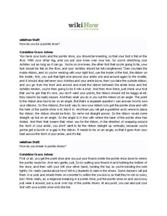 Try the first class. Now that your shoes are broken in, you can go to your first class. For a beginner’s class, you will spend a good amount of time at the barre for warm up exercises. You probably won’t go in the center at first. Your teacher will decide that for you. Dancing en pointe is very hard, and being good at it is even harder.