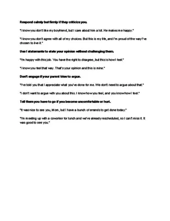 - Plan and practice responses to things that you expect your parent to say. This will help to make it easier for you to respond in the moment. For example, if your father often criticizes your decision to become a teacher, you might prepare a response such as, “I love teaching and I am glad I chose this career for myself.”