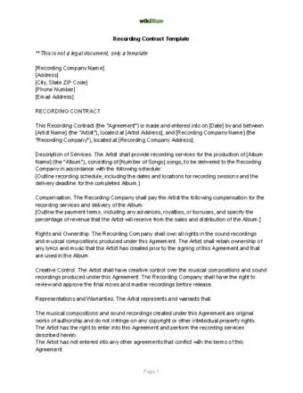 A recording contract is an agreement between a record label and an artist. The contract identifies the artist’s recording obligations and explains how the record label will market and distribute copies. The contract also explains how royalties are calculated for each sale. Recording contracts are usually drafted by the record label, though an artist should have a general sense of what is in one. In order to make sure that the recording contract is complete, the drafter should show it to a qualified attorney.