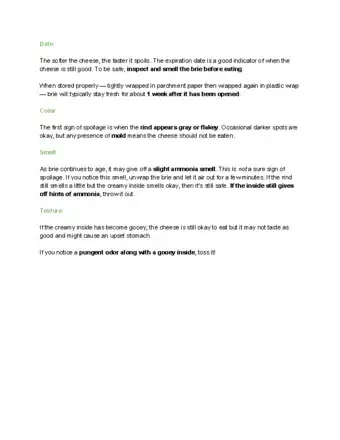 4Throw away the cheese if it smells like ammonia. Brie generally keeps for a couple of weeks until it is opened, and after that, it lasts a week or less. The rind turns gray and flaky as the cheese spoils. Green and pink mold spots are things you don’t want anywhere near your mouth. The inside of the cheese turns gooey and has a nasty chemical smell as it goes bad.[4]