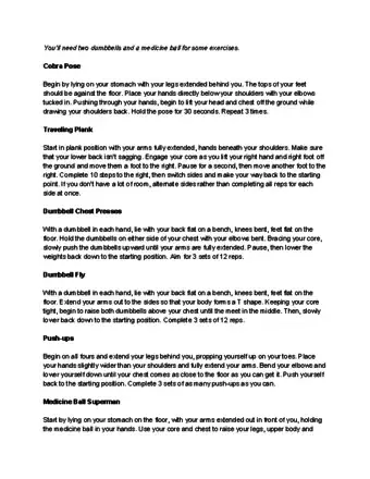 2Do t-planks. This exercise will help to stretch out your chest and build muscle, while also toning your arms. You will need a set of 5 to 10 pound dumbbells. To perform this exercise correctly:
