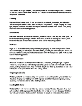 5Do elbow squeezes. This is a simple exercise that works out the chest muscles. You will need dumbbells again for this exercise.