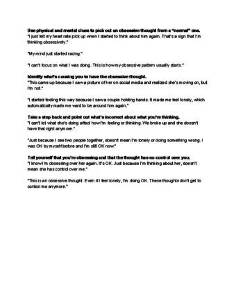 - Obsession often involves thoughts like, “What if I did this?” or “What are they doing right now?” These thoughts focus on other locations or dwell on the past or future. Concentrating on your surroundings can help you keep your thoughts in the here and now.