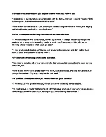 1Lay out specific, relatable, achievable expectations for behavior. Vague directives like “be good or you’ll be in trouble” or “you better shape up if you don’t want to be grounded” don’t give kids enough information to form a clear understanding of conditions and consequences. Establish clear rules that are reasonable based on your child’s age and circumstances, and use “if...then”-style language to lay out the consequences of breaking the rules.[1]