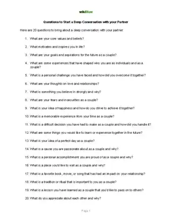 Start with basic questions, then get deeper. It can be tough to dive into the deep stuff right away. Start out by asking basic questions, like how your partner is doing or what work was like. After that, you can segway into something deeper.[4]