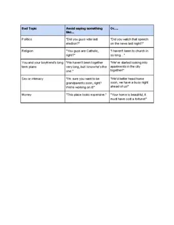 - If any of these topics come up, do more listening instead of talking. Wait until you know his family better before you discuss these topics.
