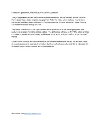 Keep the introduction under 1 minute. Remember that you are there to introduce the guest speaker and that your introduction is just the precursor to the main talk. Keep your piece to about 30 to 40 seconds, a minute at most. A few short paragraphs are usually enough to set the stage.[9]