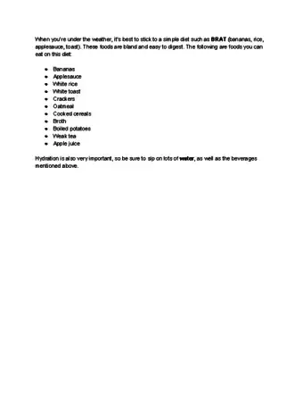 - Once you’re able, try solid foods on the BRAT diet and other simple options such as boiled potatoes and clear soups. You can add more complex foods as you feel better.