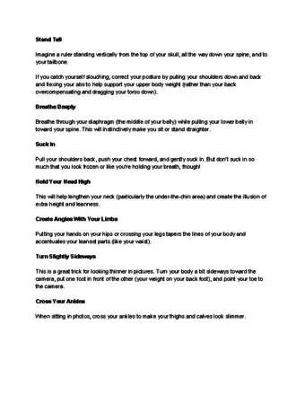 Use good posture. Standing with proper posture will pull in your tummy and make you look easily 10 pounds lighter or more. Keep your back straight and your shoulders back. Sometimes this can be very uncomfortable, if you're used to standing with poor posture, but it can make a huge difference visually.