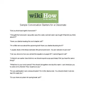 When you start making small talk with someone, try to find common ground with them. For instance, you might ask a question like, "What kind of music do you listen to?" or, "Do you have any recommendations for good movies?". You can then build on that subject, like mentioning that you had that same teacher for a class last year, for instance. Build on the conversation by either asking the person a question or telling them something about yourself. For instance, you might ask, “Who’s your favorite teacher?” For tips on ending the conversation on a friendly note, keep reading!