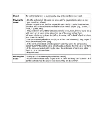 Bullshit is a fun multiplayer card game where players bluff and try to get rid of all their cards before the other players. To start the game, deal out all of the cards between the players and choose one player to go first. The first player must play one or more aces face-down in the center of the playing area. Then, the player to their left must play one or more twos. The next player must play one or more threes, the next player one or more fours, and so on. Players must announce what they’re playing out loud to the rest of the group. For example, if a player plays one ace, they would say “One ace.” Since the cards are played face-down, players can lie about what they’re playing. For example, if a player needs to play a four but they don’t have any fours, they could lie and play a 5 instead. If a player thinks another player is lying, they can say “Bullshit” or "BS" and check the cards. If they were right, the player who lied picks up all of the cards in the middle. If they were wrong, they have to pick up all of the cards. Play continues clockwise until one player gets rid of all of their cards and wins! To learn about variations of the game, read on!