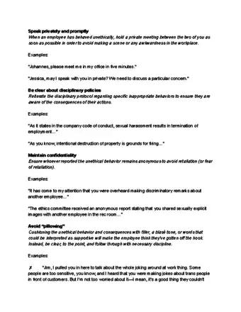 - For example, present specific examples of sexual harassment, hostile behavior, fraud, and other unethical conduct. Look online for newspaper articles or other accounts of actual misconduct. Analyze these case studies with employees during training. Ask them to identify why particular actions were unethical and how violators could have handled the scenario differently.