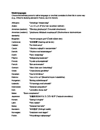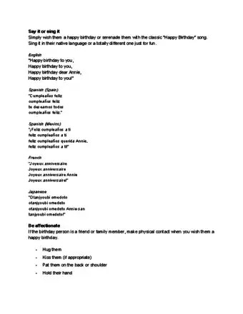 8Use your friend’s native language to wish them happy birthday. Or, if there is a destination your friend or family member has always wanted to visit, use that language. Find audio clips online of the phrase you want to say to practice the pronunciation. Most cultures also have special ways in which they wish one another happy birthday—research what those customs are to make your greeting even more unique.[9]