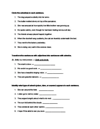 • You should get a number of different sentence suggestions for each pairing. That is part of the exercise. It shows how adverbs of manner can define a sentence. For example, for a pairing of dog/bark, a sentence might look like, “A dog barks loudly.” Or, “A dog barks excitedly.”
