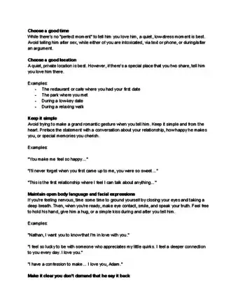 If you want to tell a guy you love him, wait for the right moment, like when you know he's feeling happy and secure. Choose a low-key, private moment when you're together, since this isn't something you want to text to him. Avoid saying it at an emotionally-charged time, like after sex or while you're both intoxicated, so that it feels genuine. When you're finally ready to go for it, keep your words simple and don't overthink things--just tell him how you feel from the heart. You can say, "I'm in love with you" in conversation, or simply lean in, kiss him on the cheek, and whisper "I love you" in his ear. For tips on handling an unexpected or awkward response from him, read on!