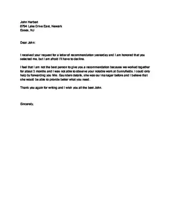 • If you can’t recommend the person based on his or her performance, try suggesting alternatives. Turn down the request and follow up with “Perhaps Amy might be able to help.”