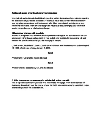 1Do not alter the will after it has been signed. The witnesses to your will testified to your capacity and acknowledged your decisions, but their signatures are invalid if the document is altered after the fact.