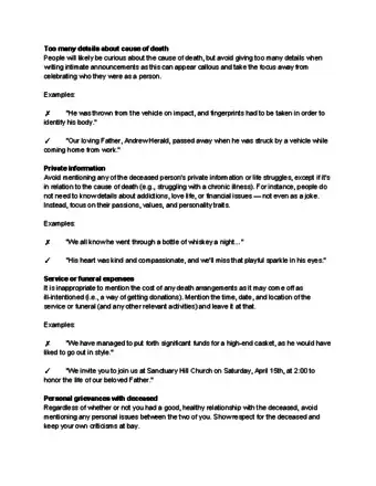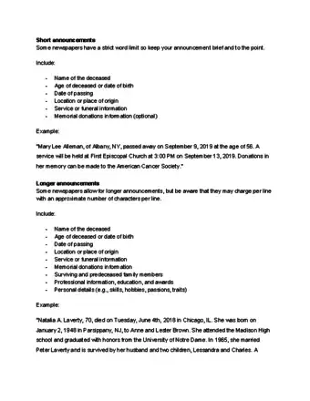 The death of a loved one is an emotional time. The last thing on your mind might be writing a death announcement to publish in a newspaper or online. Fortunately, writing a death announcement can be simple. At a minimum, you should provide the name of your departed loved one, the date of death, and when a memorial service will be held. If you choose, you can write a more detailed death announcement either for the newspaper or to announce the passing to family and friends.