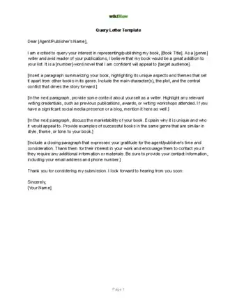 To write a query letter, start by including your name, address, and contact information at the top of the page, followed by the same information for the agent you're submitting your letter to. Then, open your letter with a greeting, and include a brief paragraph that introduces your book. Next, add a synopsis of your story, followed by a short bio about yourself. Finally, wrap up your letter and include a formal closing with your signature. Keep your letter to one page, and use professional business letter formatting. For tips on how to send query letters, scroll down!