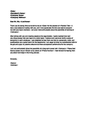 - You might write, “Thank you for meeting with me yesterday. I appreciate the time you spent explaining the specifics of the position to me, as well as the time you took to get to know me better.”