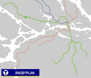Ängbyplan metro station, formerly known as Färjestadsvägen metro station, is a station on the Green line of the Stockholm metro. It is located in the district of Södra Ängby, which is part of the borough of Bromma in the west of the city of Stockholm. The station is above ground and has a single island platform, with access from the underpass taking Färjestadsvägen under the line.[3][4] The distance to Slussen is 12.4 kilometres (7.7 mi).[1]