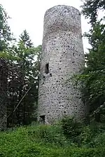 A tourist destination is the ruin of the Volfštejn Castle, located in the woods at the foot of Vlčí hora. It was built in the middle of the 13th century, the first written mention dates from 1316. It was destroyed during the battles of King George of Poděbrady with the opposition in 1470. The best-preserved part is the bergfried with a Romanesque arched portal. Today the ruin is freely accessible.[6]