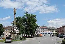 The historic centre is formed by Masarykovo Square and adjacent streets. The main landmark of the square is the town hall. It is a Neoclassical building from 1810. In the middle of the square are a Marian column from the late 17th century and a fountain with sculptures of a nymph and a centaur.[7]