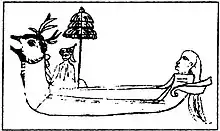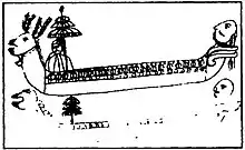 Legend says that Pudangkoi Khutkoiba, a king of the Luwangs, was once transformed into a Sangai deer. Accidentally, he was killed down by his own younger brother, not knowing his true identity. After recognising him, the head along with horns of the very Sangai deer was brought and preserved in the royal palace. In an inauguration of a royal boat of a Luwang king, the preserved horned head was decoratively installed on the stern of the royal boat. After the cultural integration of the Luwangs and the Meiteis, this tradition was also integrated into the making of the Meitei Hiyang Hiren (Meitei for 'royal boat'). Simultaneously, the sides of the boat is decorated to resemble the body of serpentine dragon, thereby looking like the feature of deity Pakhangba.[19]