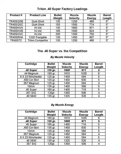 The original plan was to market the .40 Super as the .40 SIG, the big brother to the .357 SIG. The cartridge was introduced in 1996 to Michael Bussard, the assistant to the president of SigArms, and he was interested in the cartridge for use in the P220 pistol. Safari Arms also produced a couple of barrels marked "Triton 10", presumably prior to Triton selecting the .40 Super moniker.