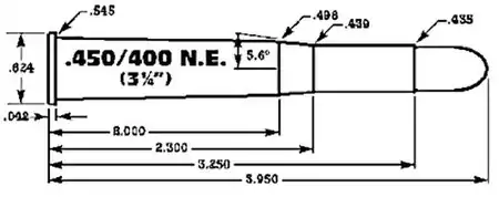 The .450/400 314-inch NE conversion was not initially entirely successful, under the increased pressures of the cordite loading the long neck could stick in the chamber causing the rim to pull off at extraction,[2] a problem not encountered under the milder black powder loadings. To counter this, the rim was increased in thickness to .042-inches. W.J. Jeffery & Co further improved the cartridge by reducing the length of the case to 3-inches and moving the neck further forward, creating the .450/400 3-inch NE.