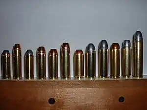 ![]() Left to Right (line by line) .44 Magnum, .445 Super Magnum, .45 Colt, .454 Casull, .480 Ruger, .475 Maximum, .50 Action Express, .500 Linebaugh, .500 Maximum, .500 S&W Magnum, .50 Beowulf, .50 Alaskan | ||||||||||||||||||||||||