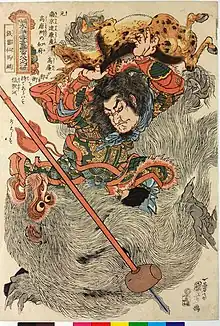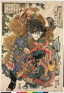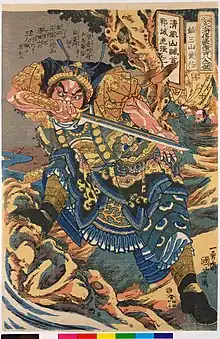 | 13 | 13 | Tiangu (天孤); Solitary Star (天孤星) | Lu Zhishen (鲁智深; 魯智深; Lǔ Zhìshēn; Lu Chih-shen) | "Flowery Monk" (花和尚) | Lu Da (魯達); Major Lu (魯提轄) | Infantry | Infantry leader | Garrison major | Weizhou (around present-day Pingliang, Gansu) | 3 | Monk's spade, Dagger | ![]() | Survives | |