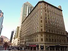 It is 11 stories tall,[2] the first two floors are retail space while the top nine floors are offices.[3] 1253 McGill College Avenue was designed in 1923 by Montreal architecture firm Ross and Macdonald[4] and was completed in 1927.[5] The first three stories of the exterior of the building along Saint Catherine and McGill College (from ground level to the second stringcourse), apart from its two corner entrances, retain their original limestone cladding, as does the entire elevation along Cathcart Street.[2] The cladding above the second stringcourse along the building's north and west elevations (Saint Catherine and McGill College, respectively) were completely replaced by prefabricated concrete panels emulating the original units between 2012 and 2014. The building's architecture is considered to be Neoclassical.[6]