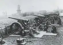 In September 1876 trials with the 15 cm zwaar staal and 12 cm Lang staal were held at the Krupp trial grounds. The results were very positive.[9] Meanwhile, comparative trials in the Netherlands between the 8 cm A. Brons and the Krupp 8,7 mm steel breechloader led the artillery committee to recommend steel field guns.[10] In light of the trials at the Krupp grounds, the Minister of War then decided to contract with Krupp. However, for the money that was voted on the 1876 budget, he bought less 15 cm zwaar staal guns and more 12 cm Lang staal guns.[9] The House of Representatives was not amused, and wanted to know how many guns had been bought at Krupp for which price.[11] In December 1876 the minister replied that the state had 20 15 cm zwaar staal guns and 60 12 cm Lang staal guns on order at Krupp. The 12 cm Lang staal gun would cost 7,980 mark, same price as before.[12] For 1877 the Minister of War then asked money for 100 12 cm Lang staal.[11]