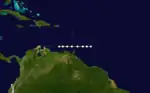 A hurricane with winds of 80 mph (130 km/h) was initially observed about 750 miles (1,210 km) northwest of the coast of Venezuela on August 13. The cyclone tracked due westward and crossed Grenada, before entering the eastern Caribbean. Heavy rain and squalls were reported in Barbados and Grenada. This system was last noted near La Orchila, Venezuela on August 14.[2][1]