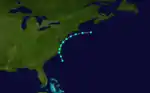 The third tropical storm of the season developed on August 19 about 170 miles (270 km) southeast of Cape Fear, North Carolina. At 1100 UTC that day, it made landfall near Cape Lookout with winds of 60 mph (97 km/h). The storm traveled north and emerged into the Chesapeake Bay near Norfolk, Virginia. The storm continued travelling northward just offshore of the east coast of the US before finally dissipating off Rhode Island on August 21.[2] Heavy rains and strong winds were reported in Connecticut, Massachusetts, New York, and Washington, D.C. This system was known as the Charter Oak Storm, because it felled the famed Charter Oak in Hartford, Connecticut.[9]