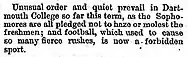 Although only three teams participated in intercollegiate football in 1870, football was played, as it had been for many years and with varying degrees of acceptance, at other schools in the north-eastern United States. At Vermont, the annual football game between the freshman and sophomore classes was held on 5 October.[3] At Dartmouth, the faculty initially banned the sport in autumn 1870,[4] but reversed course in late October. On October 29, the faculty permitted a football match to be held, for which the school furnished the balls, made the regulations and appointed an umpire.[5]