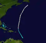 On September 9, a tropical storm was observed east of the Lesser Antilles. Over the following two days, it moved slowly north-northwestward through the islands, before reaching hurricane status on September 12. It turned more toward the north, and passed east of Bermuda on September 15. It was last observed on September 19.[4]