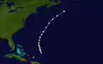 A tropical storm developed about 820 mi (1,320 km) west-southwest of the Cabo Verde Islands early on September 1.[5] On September 3, the Spanish brig Engracia became the first ship to encounter the storm.[4] That day, the cyclone intensified into a Category 1 hurricane while moving northwestward. The hurricane peaked with maximum sustained winds of 80 mph (130 km/h).[5] Early on September 6, the steamship Caribbean observed a barometric pressure of 982 mbar (29.0 inHg),[4] the lowest in relation to the storm. On September 7, the cyclone began moving northward and then northeastward later that day. The storm was last noted by the Knoch Train late on September 10,[4] about 450 mi (720 km) east of Newfoundland.[5]