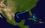 A tropical storm formed in the west-central Gulf of Mexico on September 24. After initially moving northwestward, the storm curved east-northeastward by the following day. The cyclone peaked with maximum sustained winds of 60 mph (95 km/h), and due to lack of data, was believed to have maintained this intensity until making landfall near modern-day Panama City, Florida at 13:00 UTC on September 27. By early September 28, the storm weakened to a tropical depression and soon dissipated near the Florida–Georgia state line.[5] Several locations along the Gulf Coast of the United States reported heavy rainfall, with 6 in (150 mm) and 3 in (76 mm) of precipitation observed in Mobile and New Orleans, respectively.[4]