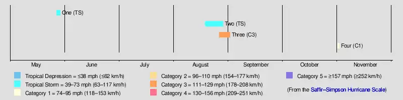 Of the season's four tropical cyclones, two reached hurricane status. One of these two strengthened into a major hurricane, which are Category 3 or higher on the modern-day Saffir–Simpson hurricane wind scale. The strongest cyclone of the season, the third hurricane, peaked at Category 3 strength, with maximum sustained winds of 120 mph (195 km/h). Rough seas produced by this storm sunk a ship in the vicinity of the Lesser Antilles, drowning 10 people. The final tropical cyclone was first observed in the southwestern Caribbean Sea on October 31. Peaking as a strong Category 1 hurricane, it headed westward and made landfall in Nicaragua, before being last noted over Central America on November 1. The storm produced only minor damage in Nicaragua. Collectively, the tropical cyclones of this season resulted in at least $1 million in damage and 14 confirmed fatalities.