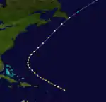After peak intensity, the storm began to weaken and fell to Category 2 strength on August 29. Later that day, the hurricane began re-curving northward and then accelerated northeastward on August 30.[2] Although the storm passed well offshore the East Coast of the United States, rough seas caused "great damage" at beaches in New Jersey. While approaching Newfoundland on September 1, the system weakened to a Category 1 hurricane. Late on September 1, it weakened to a tropical storm, shortly before becoming extratropical about 465 miles (750 km) east-northeast of St. Lunaire-Griquet, Newfoundland and Labrador.[2]